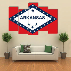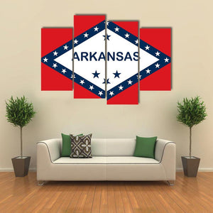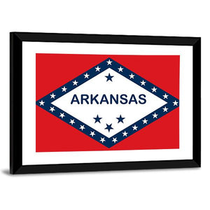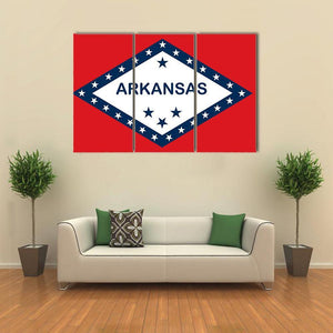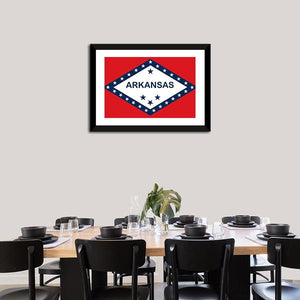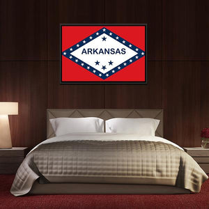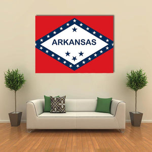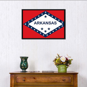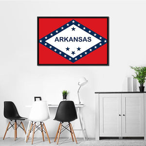 Arkansas State Flag canvas showing the state flag’s bold red, white and blue graphic with “ARKANSAS” text and stars. The symmetrical, graphic design reads as patriotic and confident, a good fit for modern home or office decor.