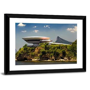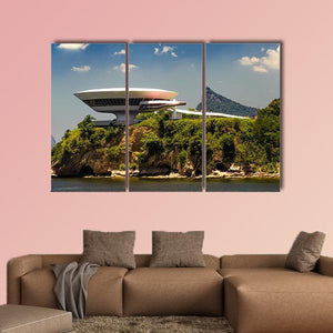 Cliff Museum In Brazil Canvas Wall Art depicts a curved modern museum building on coastal cliffs in Brazil, with blue water, a mountain peak and white clouds. Lush green foliage and a cool palette of blue, green, white, brown and grey create a serene, modern feel that fits well in modern or coastal-inspired rooms.