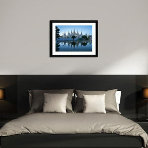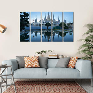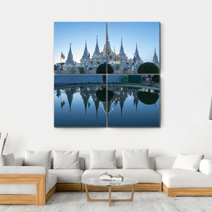 The Asokaram Temple Canvas Wall Art captures the serene beauty of Thailand's iconic pagodas amidst calm waters and lush trees. With a palette of blue, white, and gold, this artwork creates a peaceful atmosphere, perfect for inspiring tranquility in any space.