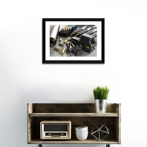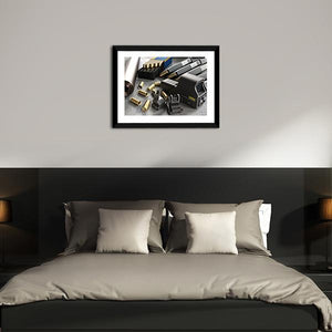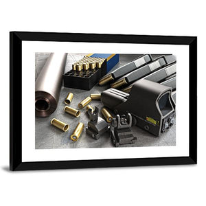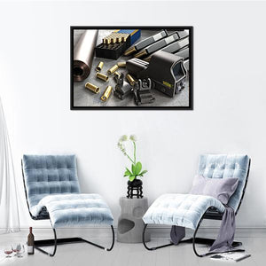 This canvas art features a detailed rendering of assault rifle accessories, including ammunition and gun parts. The realistic, industrial style evokes a serious, tactical mood, making it a striking addition to any space.