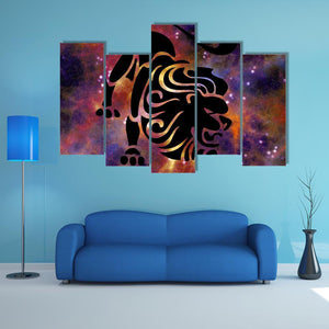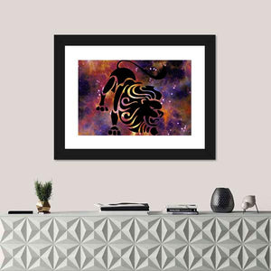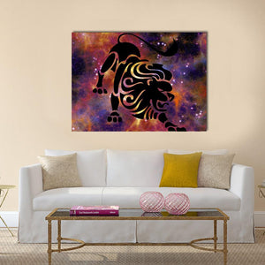 A centered, stylized lion silhouette represents the Leo zodiac against a nebula-like, starry background. The black, gold, purple, orange and white palette creates an energetic, celestial, bold mood that pairs well with modern or astrology-themed rooms.
