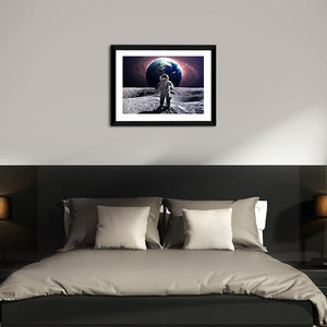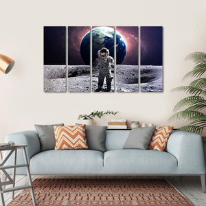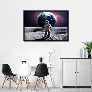 This canvas art features an astronaut in a white suit floating against a backdrop of the moon and the vast galaxy. The color palette of grey, blue, and swirling nebula adds a sense of adventure and awe, making it a captivating piece for space enthusiasts.