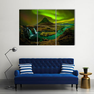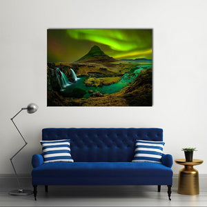 This canvas wall art features a breathtaking scene of Kirkjufell Mountain and its adjacent waterfall set against a vibrant aurora borealis. The dramatic colors and natural elements create a magical atmosphere, making it a captivating addition to any space.