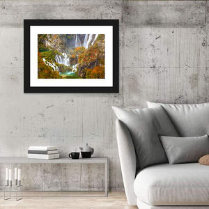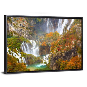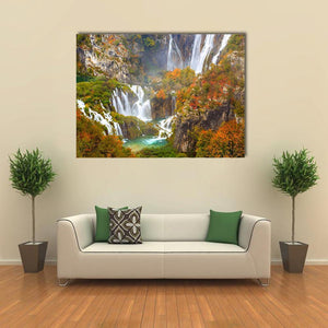 Experience the vibrant beauty of cascading waterfalls surrounded by the rich colors of autumn foliage. This canvas wall art captures the serene essence of nature, making it a lovely addition to any space.