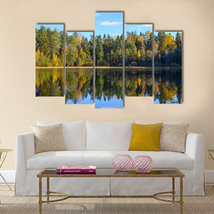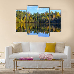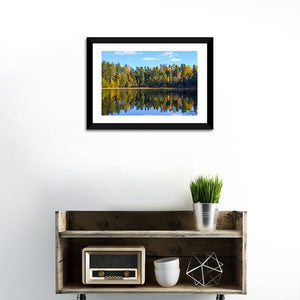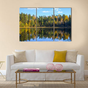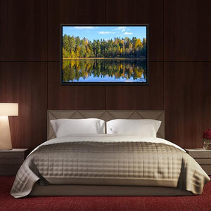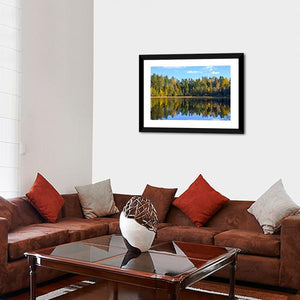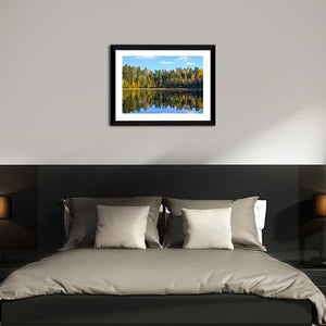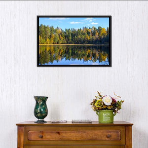 This canvas art captures a serene autumn scene featuring a tranquil forest reflected in still water. The peaceful combination of green, yellow, and blue hues evokes a sense of calm, perfect for enhancing any nature-themed space.
