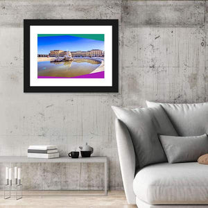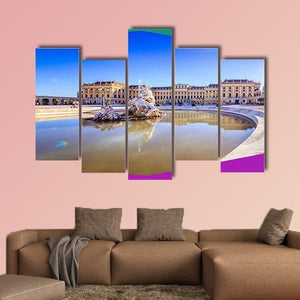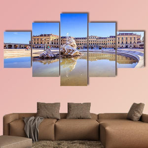 Palace Garden of Schonbrunn shows the palace, its ornate fountain and a clear blue sky with the pool’s reflection. Warm yellows and cool blues give the scene a grand, serene, majestic atmosphere. The classic subject pairs well with modern interiors and room decor that favor architectural landscapes.