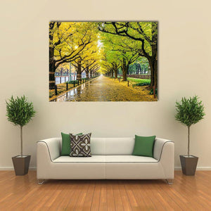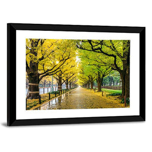 Autumn Park Tokyo captures a peaceful, tree-lined avenue in fall with fallen leaves, a wet path and soft sunlight filtering through yellow and green foliage. The photorealistic scene feels serene and autumnal, using leading lines that draw the eye down the path. It works well as calming wall decor in living rooms and entryways.