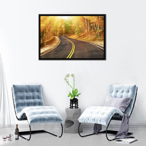 This canvas wall art features a winding road surrounded by vibrant autumn trees. The peaceful scene, marked by fallen leaves and a stone wall, invites a serene mood into any space.
