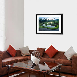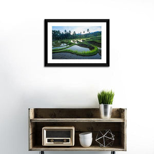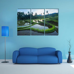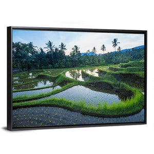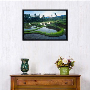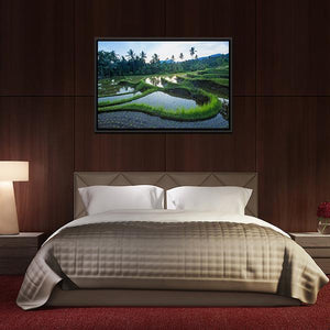 Bali Rice Terraces Canvas Wall Art depicts tiered rice paddies, tropical foliage and palm trees with calm water reflections in greens, blues and browns. The scene feels serene and peaceful and works well in modern or nature-inspired rooms as subtle wall decor.