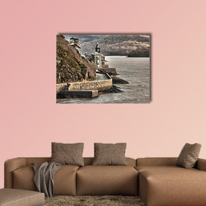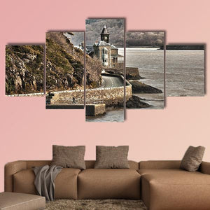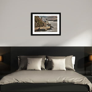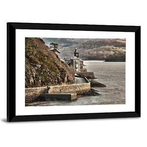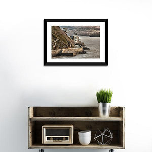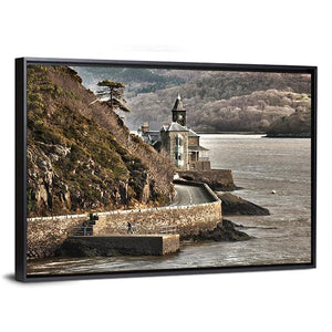 Barmouth Castle, UK shows a quiet coastal road beside a stone wall, a tree on the hillside, and a towered building watching over the water. The vintage, earth-toned print carries a serene, weathered, rugged mood and works well in coastal or rustic room decor.