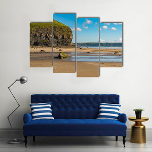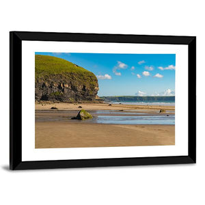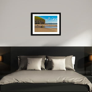 This canvas art beautifully captures a serene beach scene, highlighted by cliffs and rocky shores under a peaceful sky. The tranquil blue and tan palette evokes a natural ambiance perfect for any room.