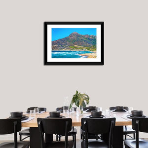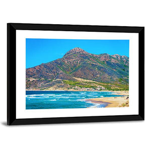 Mediterranean Sea In Buggerru shows a photorealistic beach landscape with the sea, waves, sand and a coastal town on the horizon. The image uses a blue, green, brown and tan palette and a rule-of-thirds composition to create a vibrant, serene, summery feel. It pairs well with modern or coastal room decor.