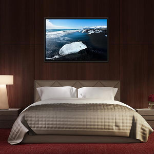This photorealistic canvas captures a wide scene of a black sand beach in the south of Iceland, featuring an iceberg on the shore, foamy ocean waves, and snow-capped mountains in the distance. The blue, white, black and gray palette gives a serene, dramatic, cold atmosphere that suits modern living rooms or entryways.