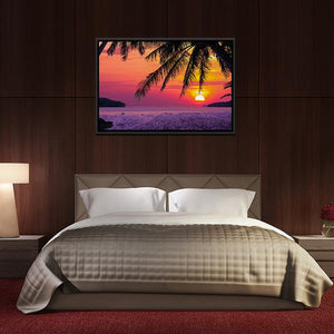 A tropical beach landscape featuring a coconut palm and sunset over the ocean, with palm fronds framing the scene. The palette of purple, pink, orange, yellow and green highlights the sun low on the horizon and light reflecting on wet sand, creating a tranquil yet vibrant feel. Composed with the rule of thirds, it fits modern or tropical-inspired rooms and coastal decor.
