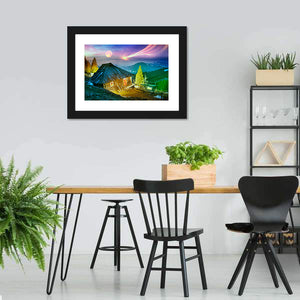 A moonlit alpine scene with snowy peaks and a small wooden cabin under a clear night sky, a full moon and a shooting star. Blues, pinks, yellows and greens give the view a magical, serene, awe-inspiring feel, with glowing stars and illuminated cabin windows. Suits rustic or modern room decor that wants a dramatic nature focal point.