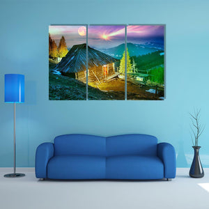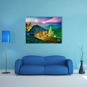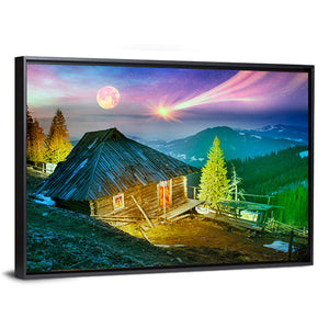 Mountain Cabin Beneath Aurora Borealis Canvas Wall Art