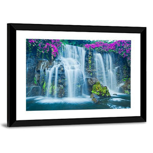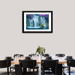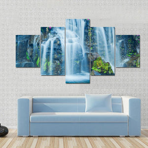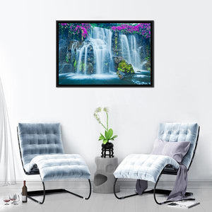 This canvas features a serene waterfall scene framed by mossy rocks and pink flowers. With its calming colors of blue and green, it brings a natural touch to any space.