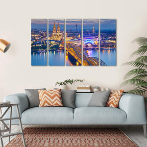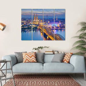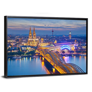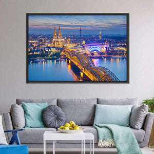 This canvas art features a vibrant city skyline of Cologne, capturing its iconic cathedral and elegant bridges. The lively scene is enhanced by the warm glow of lights reflecting on the river, creating a romantic atmosphere that brightens any space.