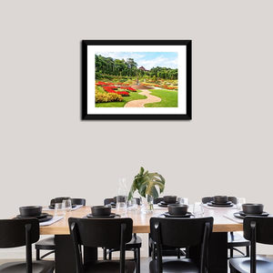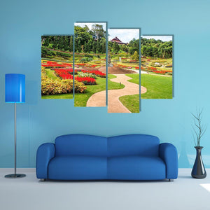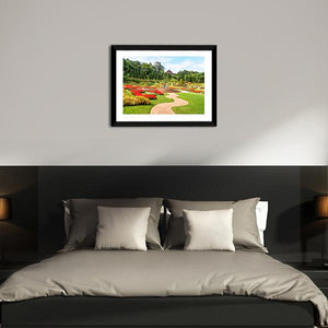 Garden In North Thailand shows a peaceful, vibrant garden with layered flower beds, a curving path and distant trees under a cloudy sky. Rendered realistically in greens, reds, yellows and blues, it pairs well with modern or nature-inspired room decor.