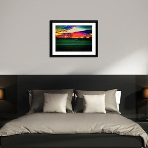 Beautiful Indiana Sunset Canvas Wall Art shows a vibrant sunset over a field with a house and silhouetted trees, highlighted by colorful clouds. The rule-of-thirds composition and a warm palette of orange, red, blue, yellow and green give the scene a dramatic yet serene feel. This colorful landscape print suits modern or nature-inspired rooms.