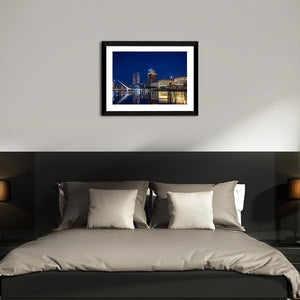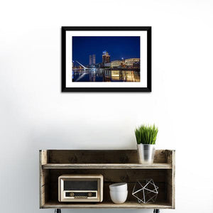This canvas art features the stunning city skyline of Puerto Madero, highlighted by modern architecture and reflections in the calm water. The vibrant palette of blues and oranges captures the urban spirit of this iconic Argentine waterfront.