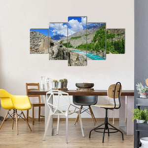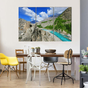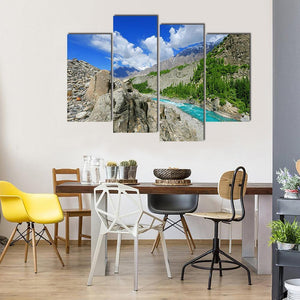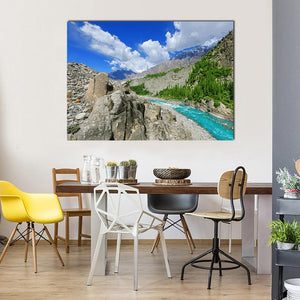 This stunning canvas features a wide-angle view of the bright turquoise river flowing through the majestic Hunza Valley, surrounded by snow-capped mountains and lush greenery. The serene atmosphere, enhanced by fluffy white clouds, brings a sense of vastness to any space.