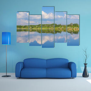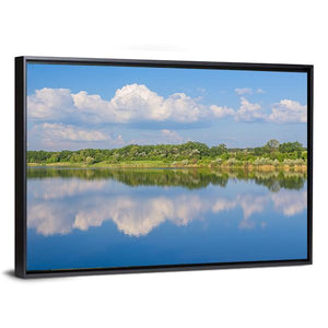 This beautiful canvas artwork features a serene lake surrounded by trees and fluffy white clouds. With its realistic style and tranquil colors, it brings a peaceful atmosphere to any space.