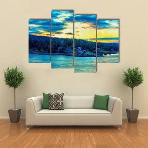 A seascape of the Strait of Georgia featuring ocean, a small island with forested houses and a strong horizon line under stormy clouds and a warm sunset glow. The image mixes vibrant, impressionistic blues, greens, yellows and grays for a serene yet dramatic mood. Suits modern, coastal-inspired room decor.