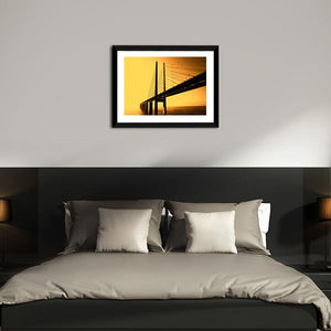 This landscape canvas showcases the majestic Oresund Bridge, surrounded by calm water and an expansive sky. The serene yellow and orange palette evokes a feeling of tranquility, making it a fitting addition to modern room décor.