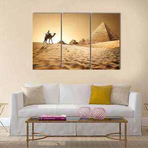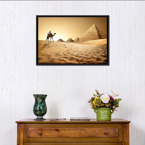 This canvas art beautifully depicts a camel in a serene desert landscape featuring Egyptian pyramids under a setting sun. The warm palette of orange, tan, and brown evokes a historic and vast atmosphere.