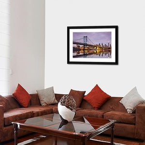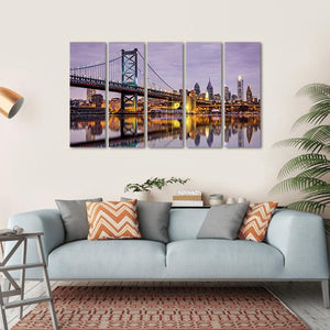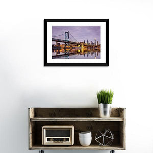 This striking artwork features the iconic Ben Franklin Bridge alongside a serene skyline, reflecting vibrant hues of purple, blue, and yellow. The composition captures the beauty of Philadelphia's waterfront, where the bridge meets the water, creating a tranquil yet dynamic atmosphere.