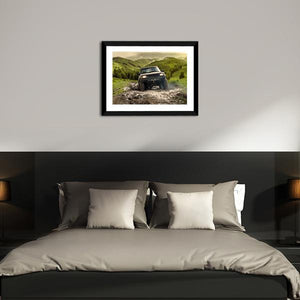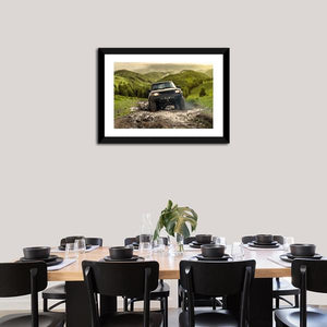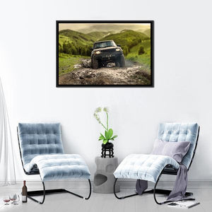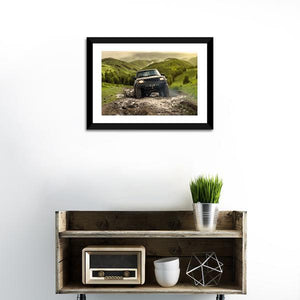 An off-road vehicle driving through mud across green and brown hills sets an adventurous, rugged tone on this landscape canvas. Composed with a rule-of-thirds layout and a rustic palette of green, brown, grey, and yellow, the print feels dynamic and automotive-focused. Suited to rustic or modern home decor and automotive-themed spaces.