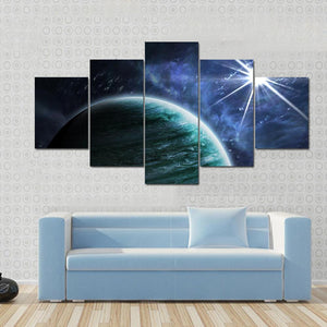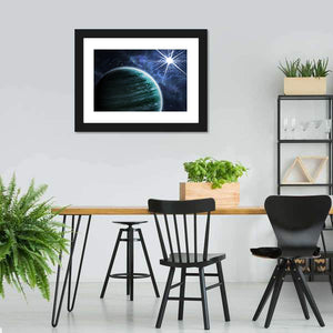 This canvas art features a swirling green planet surrounded by dark blue nebula clouds and a bright, starburst-shaped star. It evokes a cosmic and mysterious atmosphere, enhancing any modern space with its abstract style.