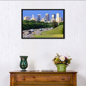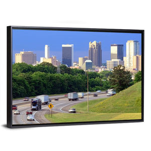 Photorealistic wide-angle view of an Alabama city skyline and busy highway, with trucks and cars passing by lush green trees and tall buildings in the distance. The blue, green, gray, and white palette creates an urban, scenic mood and suits modern living rooms or offices as wall art.