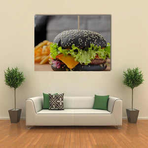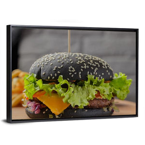 Black Burger Canvas Wall Art centers on a close-up food photograph of a black sesame seed burger with french fries. The appetizing palette of black, green, yellow and brown brings out lettuce, cheese and pickled onions for a bold, modern feel. Works well in kitchens, dining areas, or casual restaurant spaces.
