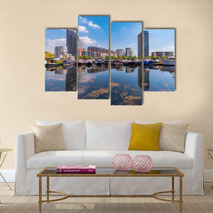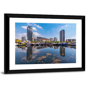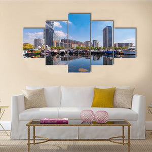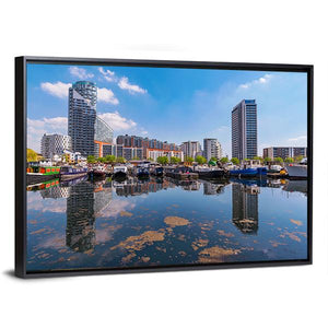 Blackwall Basin Riverside Canvas Wall Art captures a wide-angle cityscape of modern waterfront architecture, docked boats and clear reflections on calm water. The palette of blues, greens, greys and browns creates an urban, vibrant yet serene atmosphere that suits modern living rooms or home offices.