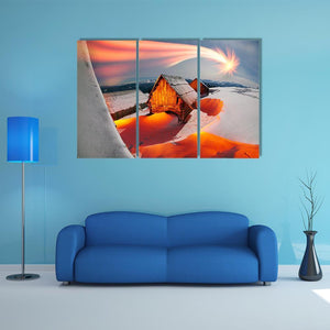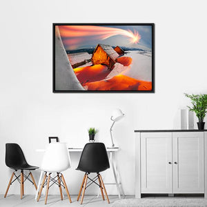 This canvas depicts wooden cabins in a blizzard-covered alpine field beneath a dramatic sunset sky. Streaking clouds and a sunburst wash the snowy landscape in orange, yellow, blue and white, creating a serene, awe-inspiring mood. It fits modern or rustic home décor.