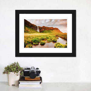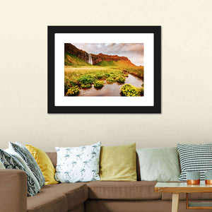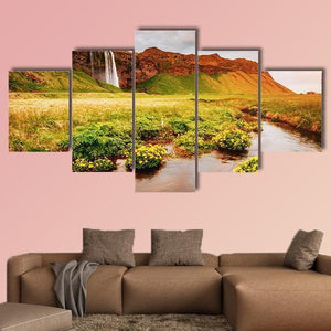 This landscape canvas shows a green field dotted with yellow flowers, a river running through the grassland, and a mountain with a cascading waterfall, creating a serene, majestic nature scene. Composed using the rule of thirds and a palette of green, brown, blue, orange and white, it suits nature‑inspired or modern rooms as a calm, natural accent.