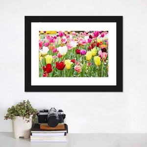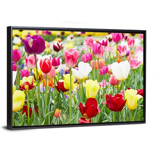 Experience the vibrant beauty of a tulip field with this stunning close-up canvas. Bursting with cheerful colors like red, pink, yellow, purple, and white, this piece brings a lively touch of nature to any wall.