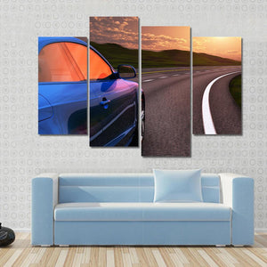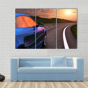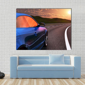 This beautiful canvas print features a blue car driving along a winding road at sunset. The warm orange and serene blue hues create a sense of freedom and adventure, making it a perfect addition to any modern decor.