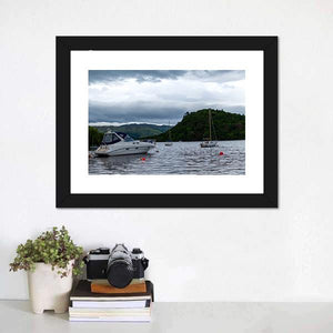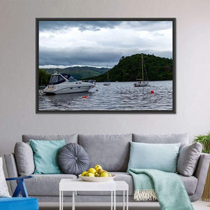 Boats Anchored In Lake shows boats on calm, overcast water beneath forested hills and a cloudy sky. A white motor yacht, sailboats and red buoys appear in a realistic blue-green palette, creating a quiet, moody scene that works well with modern home decor.