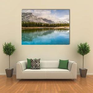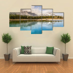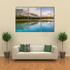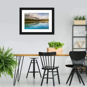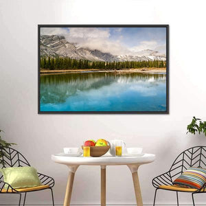River & Mount Yamnuska shows snow-capped mountains, pine trees and a mirror-like lake, with the river reflecting the peak. A palette of blue, green, grey and white creates a serene, tranquil, majestic atmosphere and suits modern or nature-inspired rooms.