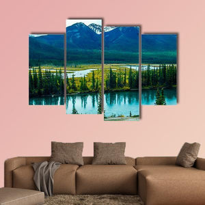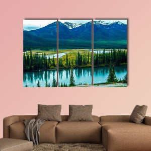 Bow River Through Valley shows a tranquil mountain scene: a river winding through a coniferous forest with snow-capped peaks. Cool blues and greens arranged by a rule-of-thirds composition give the image a serene, majestic mood that suits modern or nature-inspired rooms.