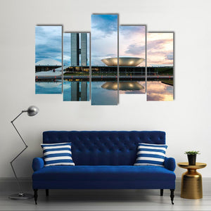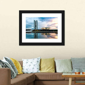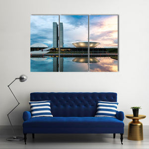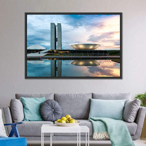 This canvas art features the majestic Brazilian National Congress, showcasing its modern architecture and reflective pool. With a calm and bright palette of blue, gray, and white, it adds a sophisticated touch to any space.