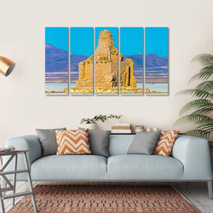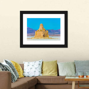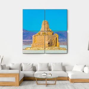 This canvas wall art features a weathered stone structure set against a serene landscape of salt flats and mountains. The calming palette of blue, tan, and purple evokes a sense of awe, making it a striking piece for various decor styles.