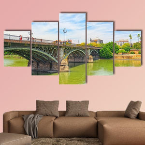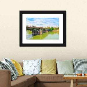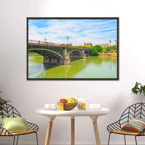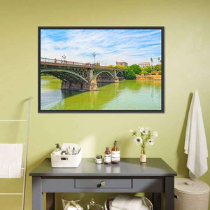 Bridge Of Isabel II Canvas Wall Art depicts a realistic landscape: an arched bridge spanning a river with trees and nearby buildings under a cloudy sky. The greens, blues, browns, and whites create a serene, bright, architectural atmosphere with clear depth in the composition. It suits modern room decor and architectural-focused interiors.