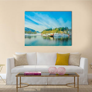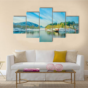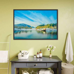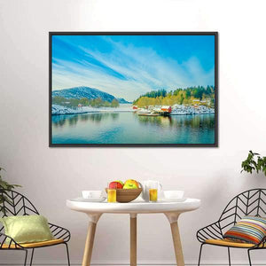 A photographic landscape of a snowy waterfront village set among fjords, with red wooden buildings, snow-covered trees and icy water. The scene feels serene and crisp, with streaky clouds and layered depth. Suited to modern, nature-inspired rooms and calm interiors.