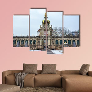 This canvas print features Zwinger Palace in Germany, highlighting the domed crown and the arched colonnade dusted with snow. The symmetrical, classical baroque composition reads grand and historic, a refined choice for formal or traditional room decor.