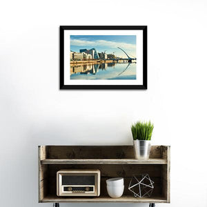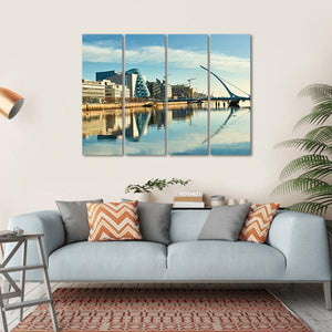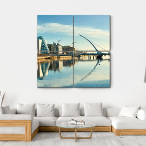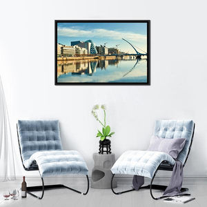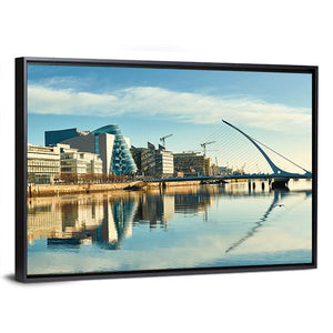 This captivating canvas art features riverfront buildings along the Liffey River, showcasing their striking modern architecture reflecting on calm waters. The serene and bright colors in shades of blue, beige, and brown create a peaceful urban atmosphere, perfect for any contemporary space.