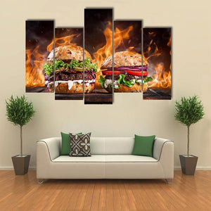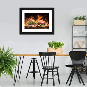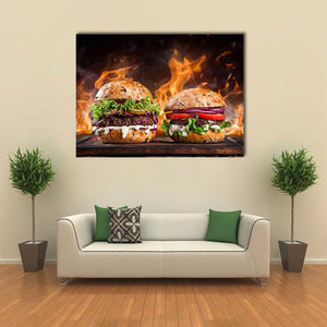 Two hamburgers sit on a wood background with flames, captured in a dramatic food-photography style that reads as appetizing, bold, warm and exciting. The image uses rule-of-thirds composition and a rich palette of red, green, brown, orange and black — a lively choice for kitchens, dining spaces or restaurant walls.